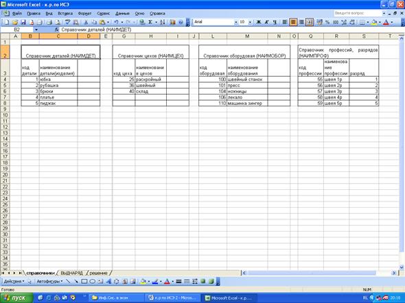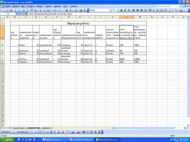 Входная информация: код детали, номер цеха, код оборудования, код профессии, разряд работы, норма штучно-калькуляционная на деталь, план производства деталей на квартал и месяц квартала.