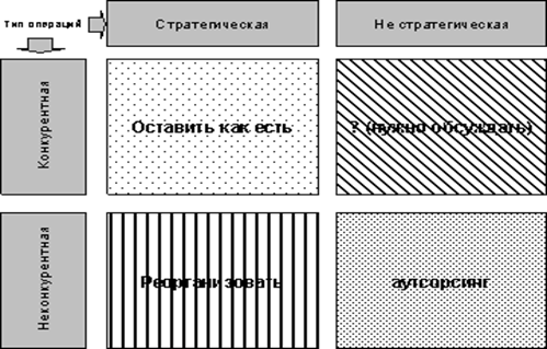 Традиционно считается, что на аутсорсинг следует передавать лишь второстепенные, периферийные функции, некритичные для конкурентоспособности компании, основная же деятельность (core competencies), дающая долгосрочное конкурентное преимущество, должна быть жестко контролируема и тщательно защищена.(см. приложение 1)