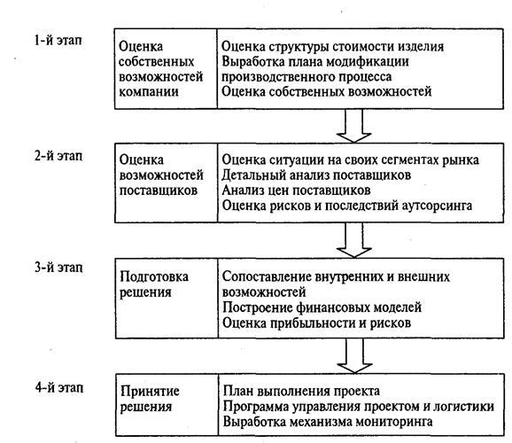 Процесс принятия решения о передаче каких-либо операций по аутсорсингу должен пройти четыре этапа: оценка собственных возможностей компании; оценка возможностей поставщиков; подготовка решения; принятие решения.