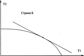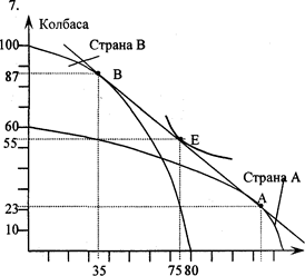 7. Даны кривые производственных возможностей двух стран А и В, а также установившееся мировое соотношение. Определите направление экспорта и импорта каждого товара и их объем.