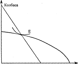 Решение: на графике видно, что страна А специализируется на производстве сыра, а страна В – на производстве колбасы. Также на графике показана точка Е – точка равновесия между спросом и предложением для обеих стран. Таким образом, для страны В экспорт составит 87, импорт 35, а для страны А экспорт составит 115, импорт – 23.