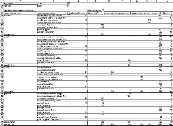 Результатом решения задачи по начислению заработной платы предназначенной для конкретных заказов в разрезе цехов является: