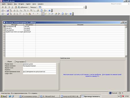 · выделим в объекте «Таблицы» команду «Создание таблицы в режиме конструктора» диалогового окна с именем файла «Сведения об общезаводских затратах»;