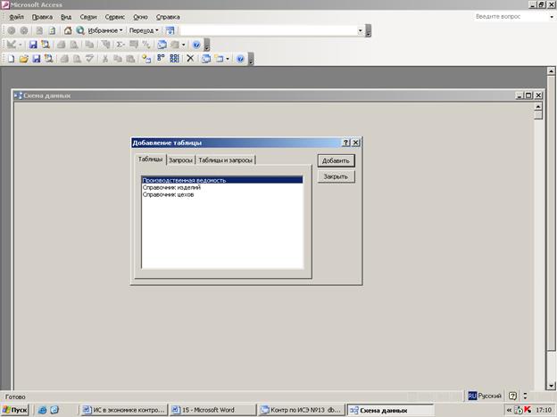 · нажмем «Связи» и в его контактном меню – «Добавить таблицу»: появляется диалоговое окно «Добавление таблицы» (рис. 7);