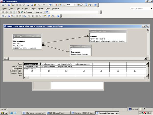 · в первом столбце запроса выберем имя поля: «Наименование изделия» из таблицы «Справочник изделий»; во втором – «Заработная плата за изделие» из таблицы «Производственная ведомость»; в третьем – «Коэффициент общезаводских затрат по цеху» из таблицы «Справочник цехов»; в четвертом столбце в имени поля введем формулу: «Общезаводские затраты за единицу продукции: [Заработная плата за изделие]*[Коэффициент общезаводских затрат по цеху]»