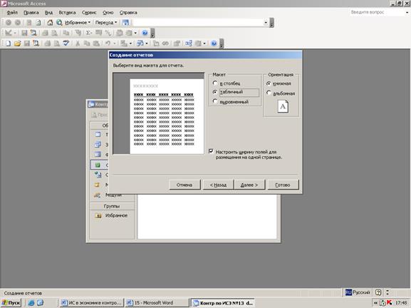 · нажмем кнопку «Далее»: появляется диалоговое окно «Создание отчетов» для выбора вида макета для отчета;