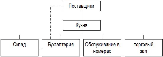 Информация от поставщиков попадает на кухню шеф-повару. Если она касается пополнения склада, то она проходит через бухгалтерию, где поступивший товар оформляется документально. В отдел бухгалтерии поступает также поток финансовой информации о полученной выручке. Из отдела обслуживания в номерах на центральный кухонный терминал поступают заказы от гостей отеля. Также заказы поступают и из торгового зала.