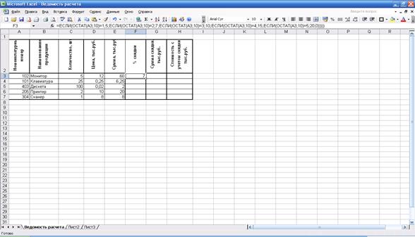 Вводим в ячейку F3 формулу: =ЕСЛИ(ОСТАТ(A3;10)=1;5;ЕСЛИ(ОСТАТ(A3;10)=2;7;ЕСЛИ(ОСТАТ(A3;10)=3;10;ЕСЛИ(ОСТАТ(A3;10)=4;15;ЕСЛИ(ОСТАТ(A3;10)=5;20;0)))))