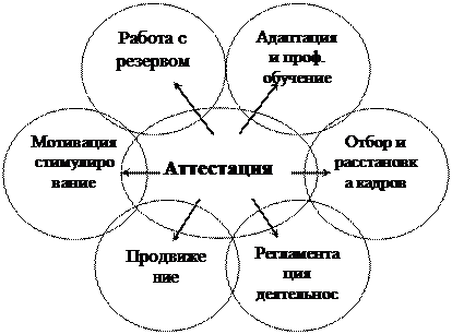 Внедрение аттестации в практику управления персоналом перестраивает его деятельность, способствуя появлению новых направлений и видов работы, существенно расширяя ее рамки. Все это предполагает особое место и роль аттестации в работе с персоналом. Нижеприведенная схема иллюстрирует эту связь аттестации с другими направлениями кадровой работы (рисунок 1.1).