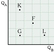 На основе гипотез порядкового измерения полезности можно сделать некоторые предсказания относительно поведения потребителя. Из гипотезы ненасыщения следует, что потребитель предпочтет комбинацию благ, представленную точкой F, комбинации, представленной точкой G, так как точке F соответствует большее количество обоих благ. Потребитель предпочтет также комбинации, представленные точками L и K, набору благ, соответствующего точке G, потому что набор K превосходит набор G количеством блага A, а набор L – количеством блага B. Однако для предсказания результатов выбора между точками F и K или F и L информации пока недостаточно.