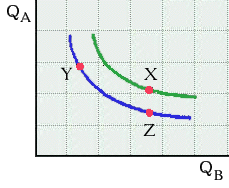 Все множество кривых безразличия в пространстве двух благ образует карту безразличия. Карта безразличия однозначно выражает предпочтения потребителя и позволяет предсказать его отношение к любым двум сочетаниям различных благ. Так, глядя на карту безразличия, изображенную на рис. 3, можно утверждать, что потребитель из двух комбинаций, представленных точками X и Y, выберет первую, поскольку по гипотезе ненасыщения он предпочитает точку X точке Z, а Z и Y для него равнозначны, так как лежат на одной и той же кривой безразличия. Следовательно, чем дальше кривая безразличия расположена от начала координат, тем большему уровню благосостояния она соответствует.
