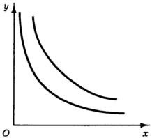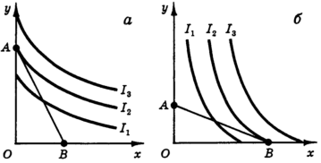 По определению кривые безразличия не могут пересекаться, так как точка их пересечения представляла бы комбинацию двух благ, имеющую для потребителя в данный момент различную полезность, что противоречит гипотезе рефлексивности. Но кривые безразличия могут оказаться смещенными к одной из осей координат, как показано на рис. 4, что отображает изменение предпочтений индивида с ростом его благосостояния в пользу одного из благ.