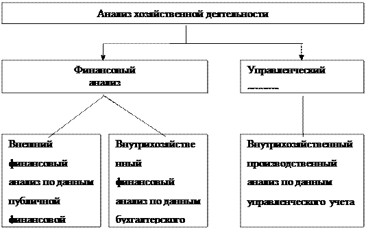 Разделение анализа на финансовый и управленческий обусловлено сложившимся на практике разделением системы бухгалтерского учета в масштабе предприятия на финансовый учет и управленческий учет. Такое разделение анализа несколько условно, потому что внутренний анализ может рассматриваться как продолжение внешнего анализа и наоборот. В интересах дела оба вида анализа подпитывают друг друга информацией.
