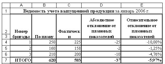 10. Заполним графу Абсолютное отклонение от плановых показателей таблицы «Фактические данные выпуска продукции по месяцам», находящейся на листе Фактические данные следующим образом: