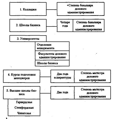 Подготовкой профессиональных менеджеров в США занимаются 1500 высших учебных заведений. В 1987 г. было выпущено 240 тыс. бакалавров в области бизнеса (24% всех выпускников) и 70 тыс. магистров делового администрирования (25% всех выпускников со степенью магистра).