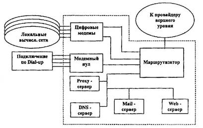 Это оборудование обеспечивает подключение пользователей через модемный пул (набор модемов) провайдера в режиме Dial-Up по телефонным линиям, высокоскоростное соединение локальных сетей посредством цифровых каналов, поддерживает работу электронной почты (Mail-сервер), осуществляет преобразование сетевых адресов из доменной формы представления в цифровую и обратно (DNS-сервер), обеспечивает доступ пользователям к собственному Web-серверу провайдера.