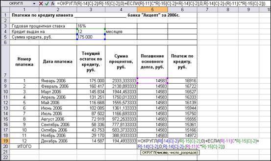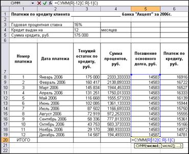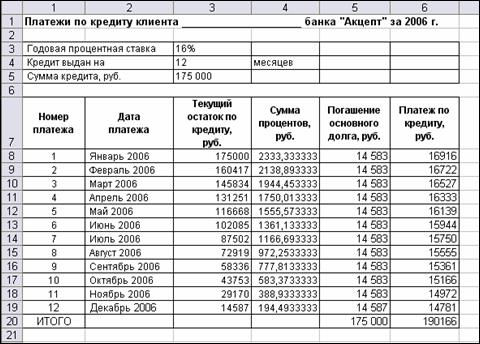14. Итоговая таблица «Платежи по кредиту клиента банка «Акцепт» представлены на рис. 14