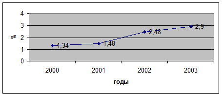 Конечно, в составе федерального, областных и местных бюджетов на очередной финансовый год, обязательно предусматривается статья расходов на различного рода социальные программы, в том числе расходы на социальную поддержку и реабилитацию инвалидов. Однако, как считает большинство политиков и экономистов, процент отчисления в данной области все же достаточно мал. На рисунке 1 изображена тенденция доли отчислений государства в составе расходов федерального бюджета за последние несколько лет на социальную программу поддержки инвалидов в нашей стране. Данные взяты из Федеральных бюджетов на 2000- 2003 годы («Российская газета от 31.12.99, 28.12.00, 28.12.01 и 30.12.02)