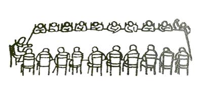 28. Эти люди стоят вокруг стола, и один из них что-то объясняет. Ты находишься среди тех, которые слушают. Обозначь где ты.