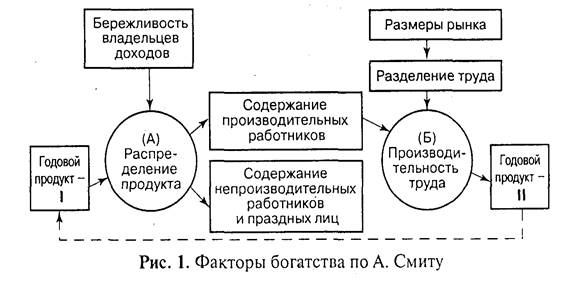 Вслед за Петти, Кантильоном и физиократами Смит считал, что богатство прирастает производством, а его источником служит труд. Правда, для Смита таким источником служил не только сельскохозяйственный труд: не отказавшись от самого разграничения между трудом производительным и непроизводительным, он предложил расширительную трактовку производительного труда. По Смиту, производителен труд, создающий новый материальный продукт, непроизводителен труд, обслуживающий потребление произведенного продукта: «...труд рабочего мануфактуры обычно увеличивает стоимость материалов, которые он перерабатывает, а именно увеличивает ее на стоимость своего содержания и прибыли его хозяина. Труд домашнего слуги, напротив, ничего не добавляет к стоимости... Труд некоторых самых уважаемых сословий общества, подобно труду домашних слуг, не производит никакой стоимости и не закрепляется и не реализуется ни в каком длительно существующем предмете или товаре, могущем быть проданным... Например, государь со всеми своими судебными чиновниками и офицерами, вся армия и флот представляют собою непроизводительных работников. Они являются слугами общества и содержатся на часть годового продукта труда остального населения». 1, с.356-357