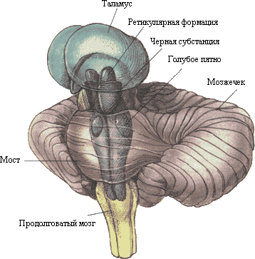 Следует отметить, что нейроны ретикулярной формации различаются не только величиной, но и составом медиаторов. Так, большинство клеток в качестве передатчика нервного импульса используют пептиды (энкефалины, нейротензин и т.д.). Вместе с тем широко представлены и моноамины. Так, ядра шва содержат серотонинергические нейроны, а нервные клетки клетки голубоватого места являются норадренергическими.