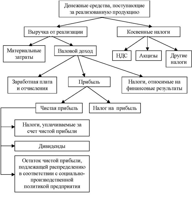 Таким образом, результат реализации продукции принимает денежную форму — форму выручки от реализации произведенных товаров, которая должна поступить на расчетный счет предприятия. Выручка за минусом налогов — это предпринимательский доход, и является источником возмещения затраченных на производство продукции средств и формирования денежных фондов и финансовых резервов предприятия. В результате использования выручки из нее выделяются качественно разные составные части созданной стоимости.