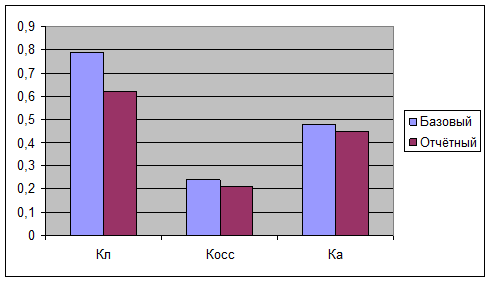 Как видно из графика в отчётном периоде, по сравнению с базовым периодом все коэффициенты, характеризующие финансовое состояние предприятия снизились.