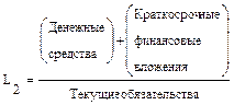 Показывает, какую часть текущей краткосрочной задолженности организация может погасить в ближайшее время за счет денежных средств и приравненных к ним финансовым вложениям |
