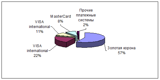 Одной из характерных особенностей рынка пластиковых карт Новосибирской области является существенное усиление позиций международных платежных систем, как за счет роста эмиссии карт, так и за счет увеличения объема операций по международным картам в торгово-сервисной сети. Если раньше этими картами пользовались лишь представители VIP, то сейчас круг их владельцев все более расширяется. Очевидно, вскоре международные пластиковые карты станут для жителей Новосибирской области привычными. В основном же лидерство принадлежит отечественной платежной системе «Золотая корона». В настоящее время в системе “Золотая корона” более 70 банкоматов и более 4500 терминалов. Ежемесячно производится более 436000 операций с использованием карточек, 95 % которых производится в предприятиях торговли и сервиса.