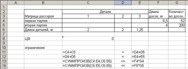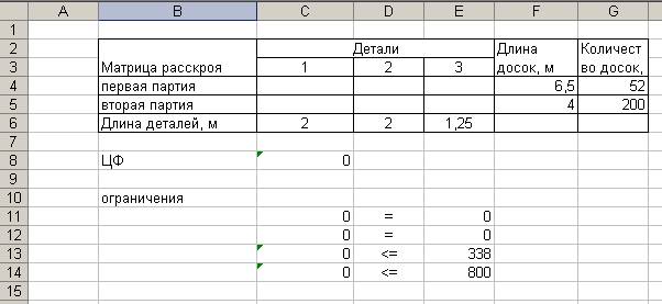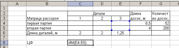 2. Создание матрицы расскроя. Для этого выполним резервирование места (в блок ячеек С4:E5), где будет после решения задачи находится план раскроя обеспечивающий максимальное количество треугольников.