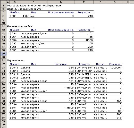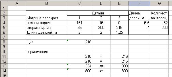 Вывод: Общее число комплектов будет максимальным (216 шт.) если из досок первой партии будет вырезано 151 шт. первой детали, 16 шт. второй, а из второй партии досок65 шт. 1-ой детали, 200 шт. 2-ой детали и 216 шт. 3-ей детали.