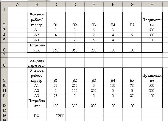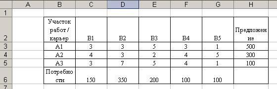 Компания, занимающаяся ремонтом автомобильных дорог, в следующем месяце будет проводить ремонтные работы на пяти участках автодорог. Песок на участки ремонтных работ может доставляться из трех карьеров, месячные объемы предложений по карьерам известны. Из планов производства ремонтных работ известны месячные объемы потребностей по участкам работ. Имеются экономические оценки транспортных затрат (в у.е.) на перевозку 1 тонны песку с карьеров на ремонтные участки.