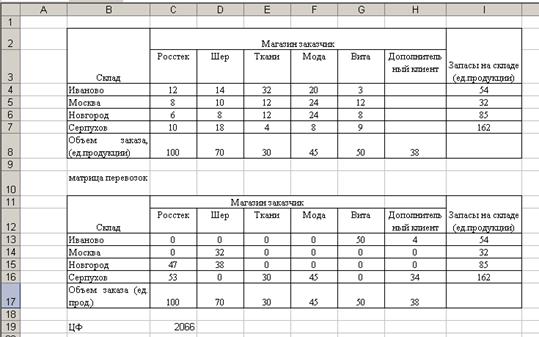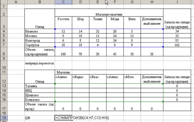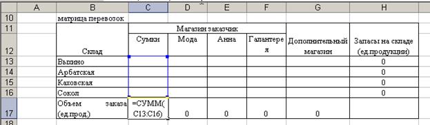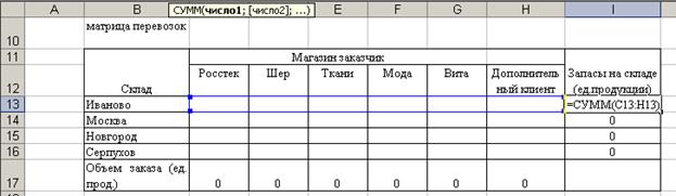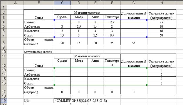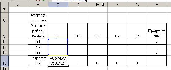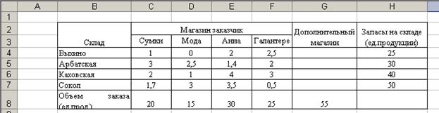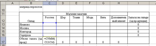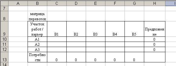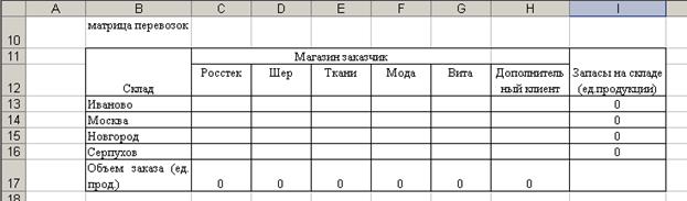 2. Создание формы для решения задачи предполагает создание матрицы перевозок. Для этого выполним резервирование места (в блок ячеек С10:G12), где будет после решения задачи находится план перевозок груза, обеспечивающих минимальные транспортные затраты. Для того чтобы решить задачу составим модель закрытой транспортной задачи, поэтому введем дополнительный восьмой склад.