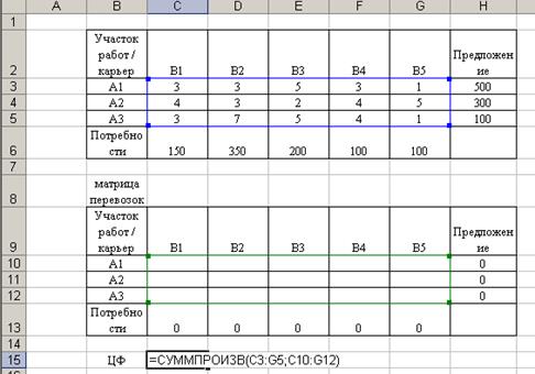 В задаче целевая функция представляет собой произведение удельных транспортных расходов (C3:G5) и количество перевозок (C10:G12). Для этого: