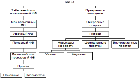 Киспользования рабочего времени = отработанное время в часах / макс-но возможный ФВ в часах