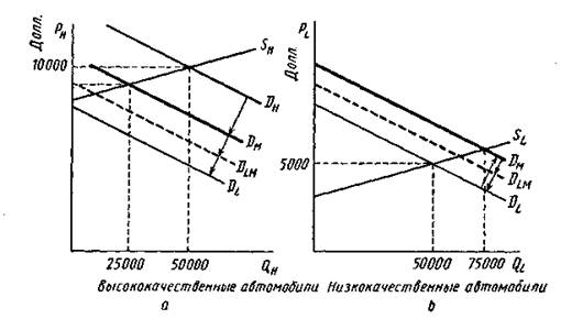Предположим, что имеются два типа подержанных машин — высокого и низкого качества. Предположим также, что как продавцы, так и покупатели могут определить тип автомобиля. На рис. 1а SН есть кривая предложения высококачественных машин, а Dн — кривая спроса на них. Аналогично SL и DL на рис. 1b — кривые предложения и спроса для низкокачественных автомобилей. Заметим, что SН выше, чем SL поскольку собственники высококачественных автомобилей расстаются с ними менее охотно и должны получить за это более высокую цену. Аналогично Dн выше DL так как покупатели готовы заплатить больше за хорошее качество. Как видно из рисунка, рыночная цена высококачественных машин — 10 000 долл., низкокачественных — 5000 долл. и при этом продается 50 000 экземпляров каждого типа.