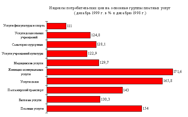 Анализ динамики роста потребительских цен на товары и услуги показал, что 1999 год отличался от предыдущего года тем, что в течение года не наблюдалось резких скачков цен. Другой отличительной особенностью изменения цен на потребительском рынке в 1999 году можно назвать возросшие темпы роста цен и тарифов на платные услуги по сравнению с 1998 годом.