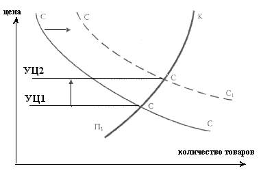 Допустим, что экономика близка к полной занятости и загруженности производственных мощностей. Рост расходов населения, предприятий и государства на потребление смещает кривую совокупного спроса вверх из положения СС в положение СС1 (рис.1). Соответственно, наблюдается и рост цен, положение которых в конечном итоге зафиксируется на уровне УЦ» .