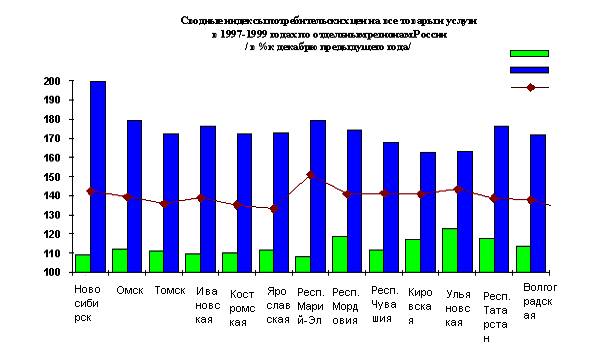 Анализируя инфляционные процессы на потребительском рынке регионов России в 1999 году можно отметить: