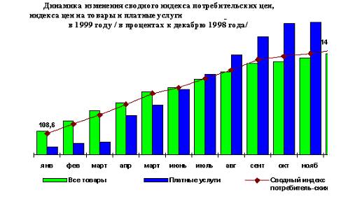Анализ динамики роста потребительских цен на товары и услуги показал, что 1999 год отличался от предыдущего года тем, что в течение года не наблюдалось резких скачков цен.