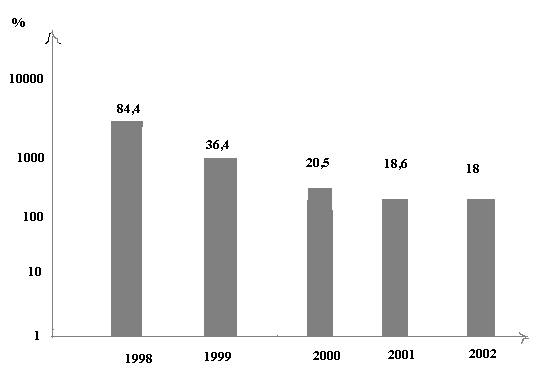 Индекс инфляции за 1998 год составил 0,844, за 1999 0,364, за 2000 0,205, за 2001 0,186, за 2002 0,18%.
