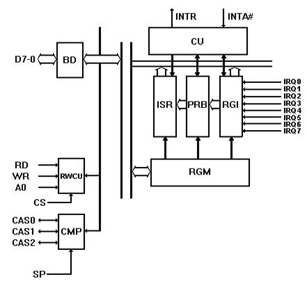 · RGM - регистр маскирования прерываний; обеспечивает запрещение одной или нескольких линий запросов прерывания;