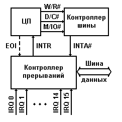 Упрощенная схема взаимодействия контроллера прерываний с процессором и контроллером шины имеет следующий вид.