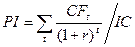 Пусть I0 — сумма первоначальных затрат, т.е. сумма инвестиций на начало проекта; PV — современная стоимость денежного потока на протяжении экономической жизни проекта.