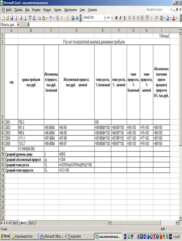 2. Технология выполнения компьютерных расчетов Расчеты показателей анализа динамики прибыли предприятия выполнены с применением пакета прикладных программ обработки электронных таблиц МS Ехсеl в среде Windows.