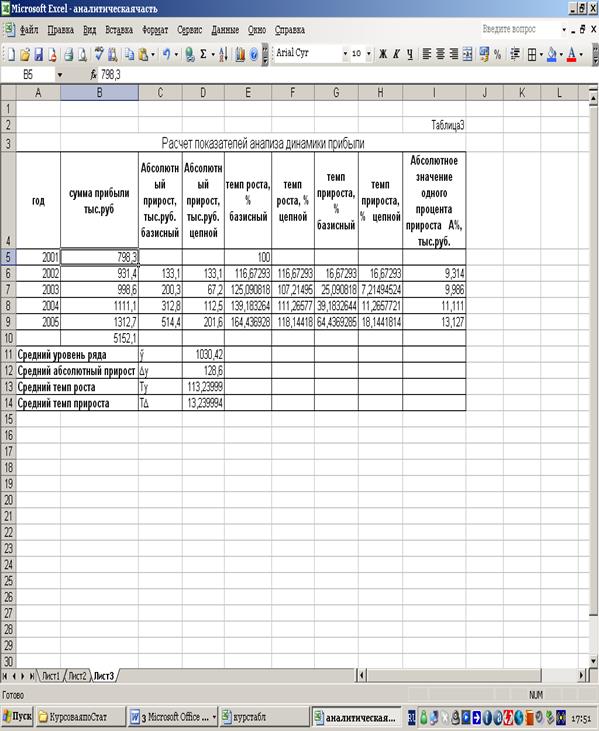 3. Анализ результатов статистических компьютерных расчетов Результаты проведенных расчетов позволяют сделать следующие выводы. Сумма прибыли за 5 лет выросла на 18,1%, что в абсолютном выражении составляет514,4тыс.руб. Наблюдается положительная динамика в течение всего периода. Об этом говорят цепные абсолютные приросты и цепные темпы роста и прироста.