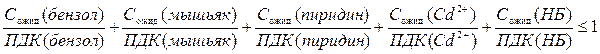 Определим ПДК каждого из этих веществ в речной воде. ПДК (мг/л): бензол (0,5); мышьяк (0,03), пиридин (0,2), Cd2+ (0,01), нитробензол (0,2), ВВ (Сф + 0,25 = 59,0 + 0,25 = 59,25).