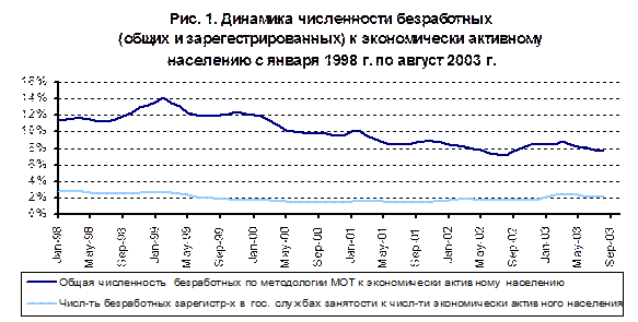 Отметим, что с августа 2002 г. по август 2003 г. (включительно) темпы увеличения уровня общей безработицы по методологии МОТ значительно ниже темпов увеличения уровня безработицы в соответствии с регистрацией безработных в государственных службах занятости (показатель общей численности безработных к экономически активному населению увеличился на 6,9%, показатель численности безработных, зарегистрированных в государственных службах занятости, к численности экономически активного населения увеличился на 26,9%). Напомним, что с января 1998 г. по февраль 2002 г. динамика данных показателей была практически идентичной, что в первую очередь связано с включением в численность регистрируемых безработных с января 2003 г. данных по Чеченской Республике.