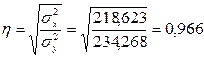 Эмпирическое корреляционное отношение указывает на весьма тесную связь между изучаемыми признаками, а коэффициент детерминации показывает, что вариация результативного признака – выпуска продукции на 93,3% происходит под влиянием вариации факторного признака - уровня фондоотдачи, а на 6,7% под влиянием прочих неучтенных факторов.