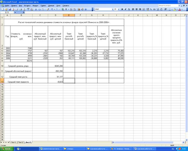 Статистический анализ динамики стоимости основных фондов отраслей экономики г. Обнинска за 2002-2006 гг. выполнен с применением пакета прикладных программ обработки электронных таблиц MS Excel в среде Windows.